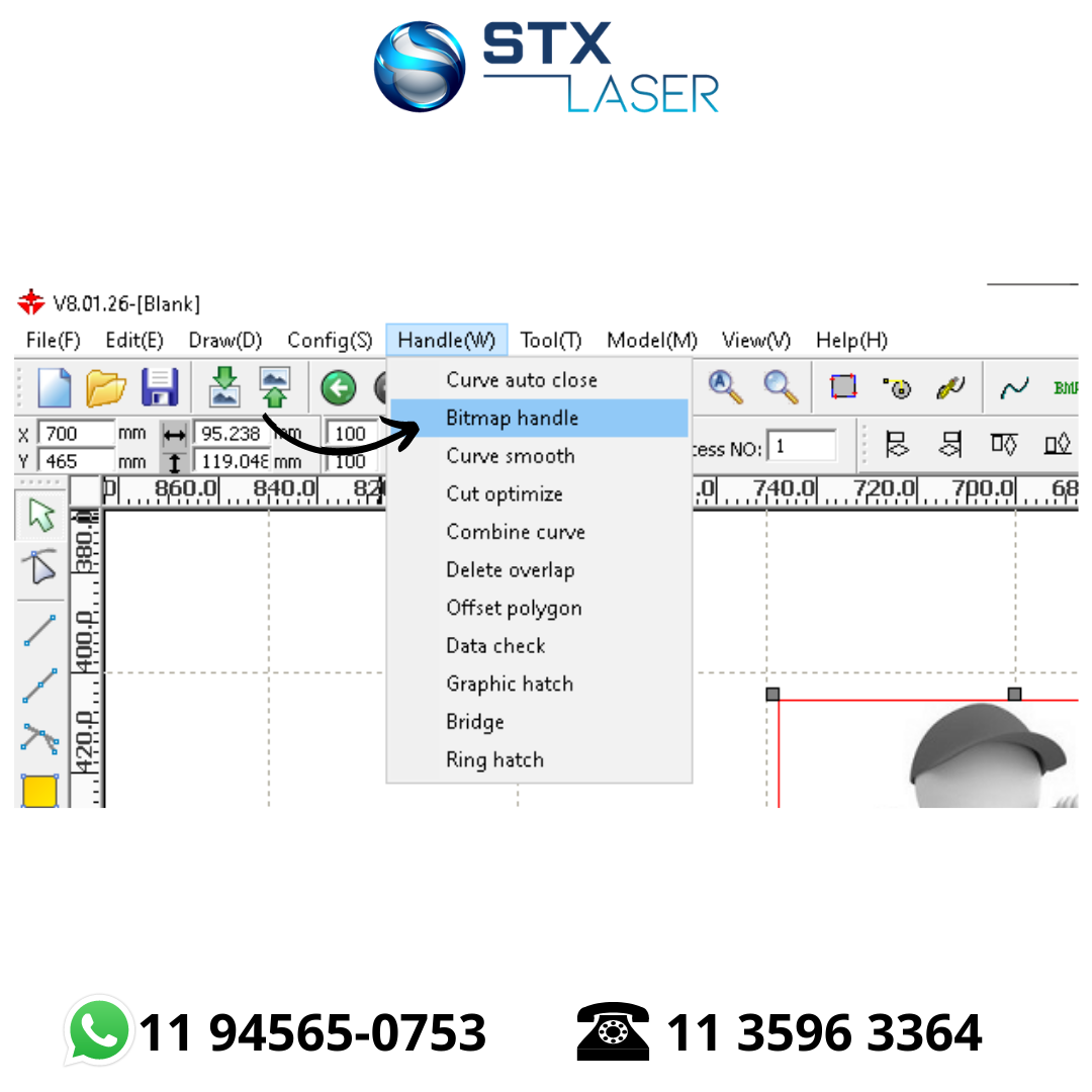 - Converta a Imagem em uma Imagem de BitMap dp Windows 1 (BMP), Onde Você Terá Apenas Pixels Pretos e Brancos Disponíveis para Você. No RDWorks, Você Pode Usar a Ferramenta (Bitmap Handle), Como Abaixo: